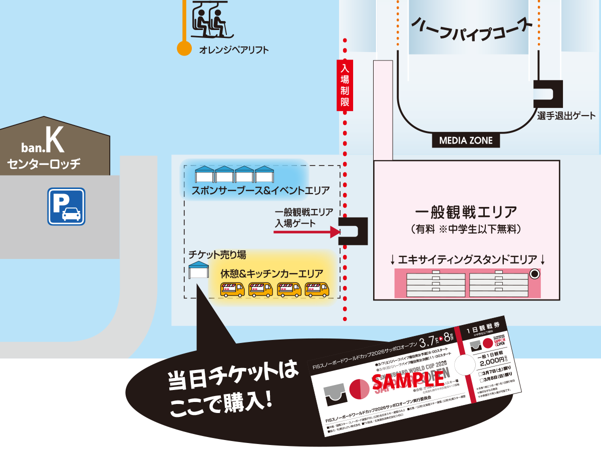 前売り券をお持ちでない方は観戦エリアの手前のチケット売り場で観戦券を購入して、観戦エリアへ入場ください。